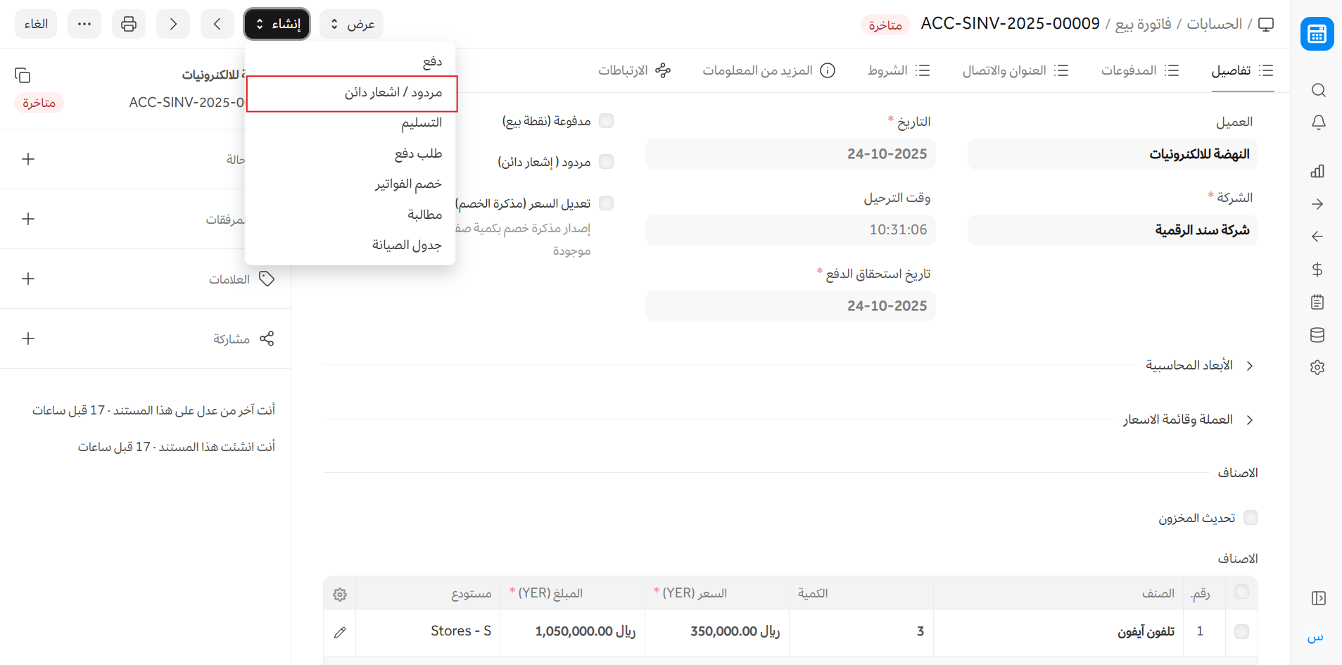 - انتقل إلى فاتورة البيع المعنية وانقر على إنشاء > مردود (إشعار دائن).
