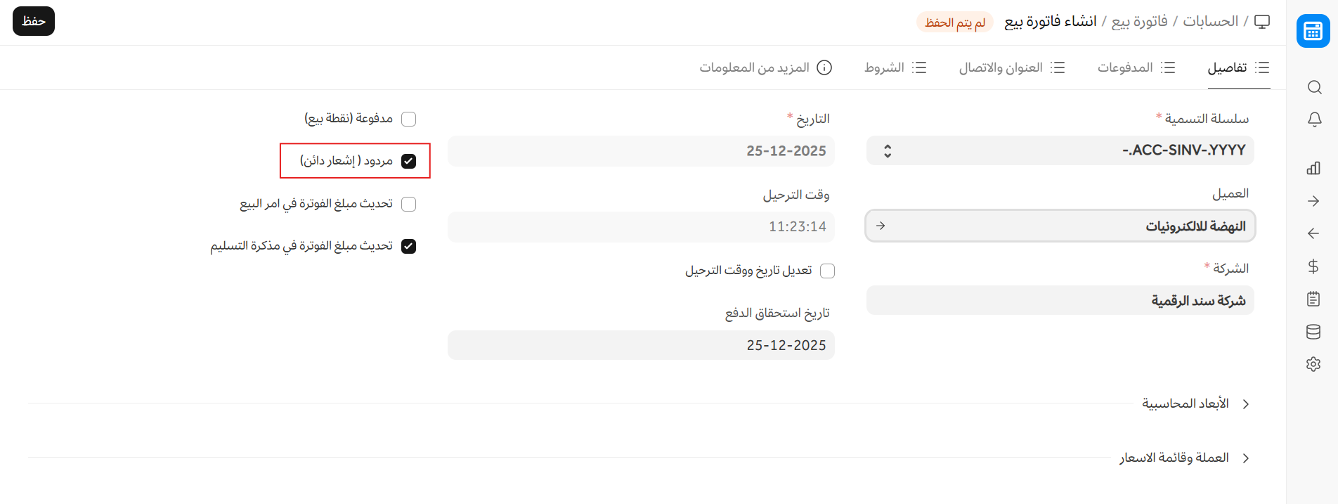 - سيتم جلب تفاصيل العميل والأصناف كما هي مضبوطة في فاتورة البيع.