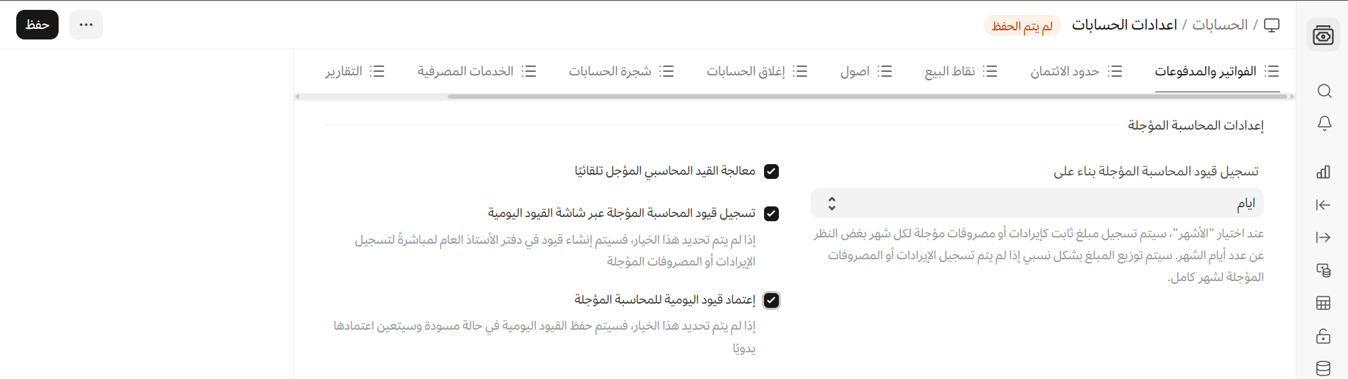 قبل البدء في استخدام المحاسبة المؤجلة، يجب أن تكون على دراية بالإعدادات أدناه والتي ستمنحك تحكمًا أكبر في كيفية إدارة محاسبتك المؤجلة.