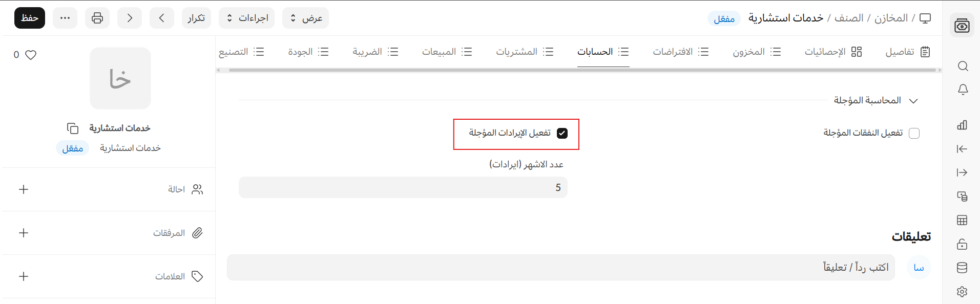 في بيانات الصنف الرئيسية المنشورة لخطة الاشتراك، ضمن قسم الإيرادات المؤجلة، حدد خانة حقل تمكين الإيرادات المؤجلة. يمكنك أيضًا تحديد حساب الإيرادات المؤجلة لهذا الصنف المحدد وعدد الأشهر.
