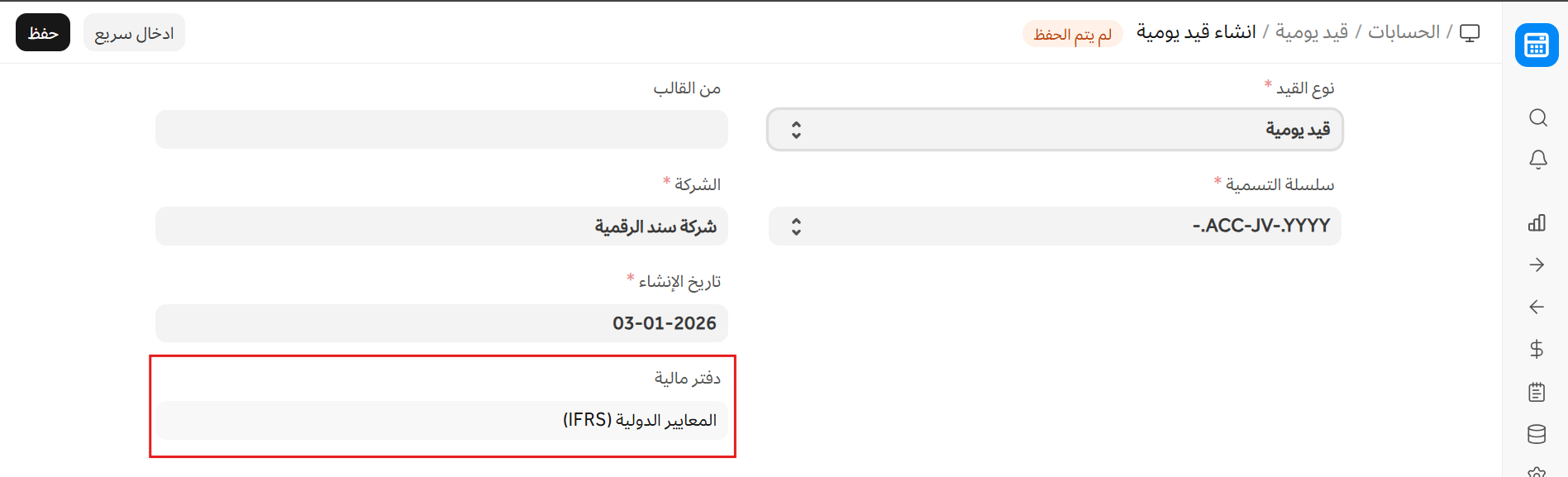 لا يعد إعداد الدفتر المالي إلزامياً. ولكن إذا اخترت إنشاء عدة دفاتر مالية، فيمكنك عندها إجراء قيود ضد دفتر مالي محدد عن طريق اختيار ذلك الدفتر في القيد اليومي. إذا كان حقل الدفتر المالي فارغاً في قيد يومي، فهذا يعني أن القيد سيكون متاحاً في جميع الدفاتر المالية.
