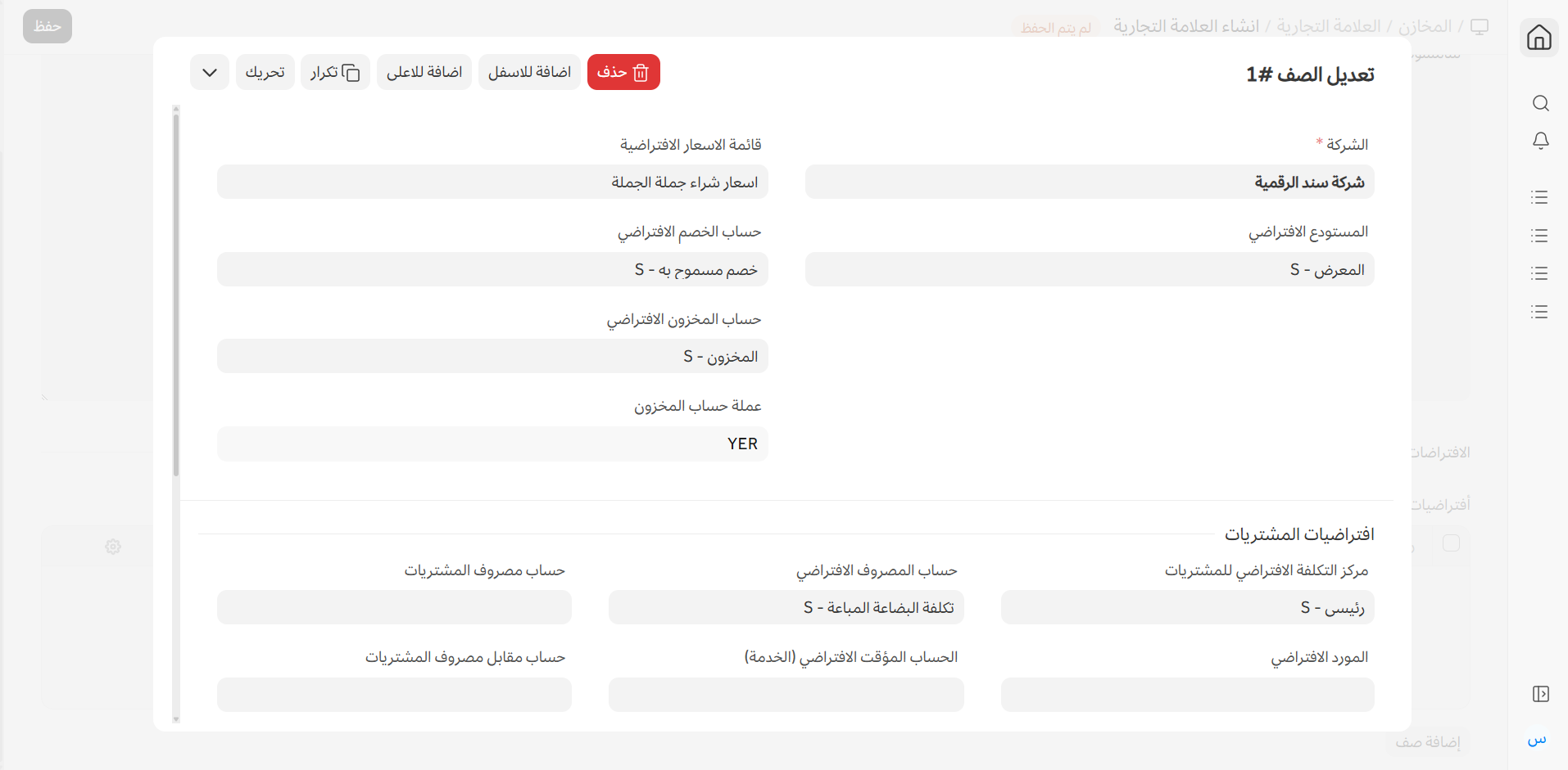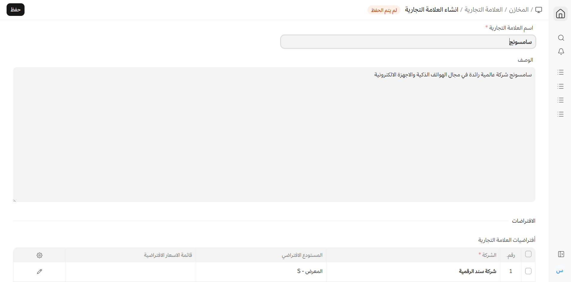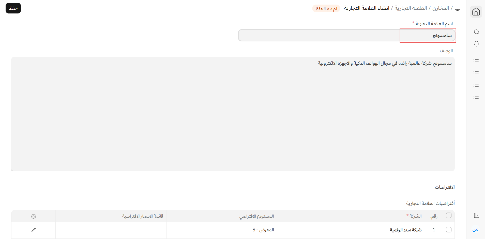 يمكن تعيين القيم الافتراضية التالية للعلامة التجارية. عند ربط هذه العلامة التجارية بصنف، سيتم جلب هذه القيم تلقائيًا عند تنفيذ معاملات البيع أو الشراء على أصناف هذه العلامة.
