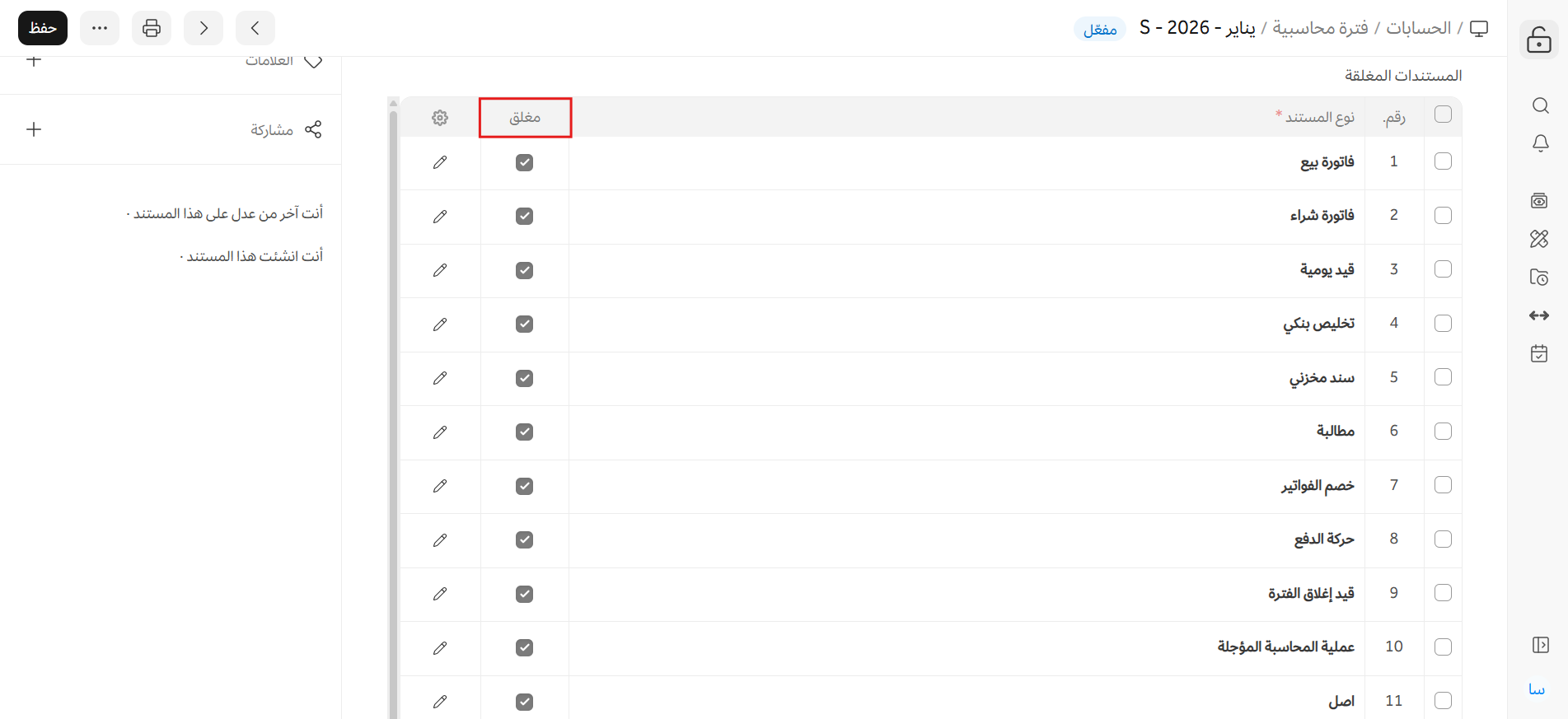 يُستخدم خيار "مغلق" في جدول المستندات المغلقة المستندات الخاصة بالمعاملات لتحديد أي منها يجب تقييده (اغلاقه) بعد نهاية الفترة المحاسبية.