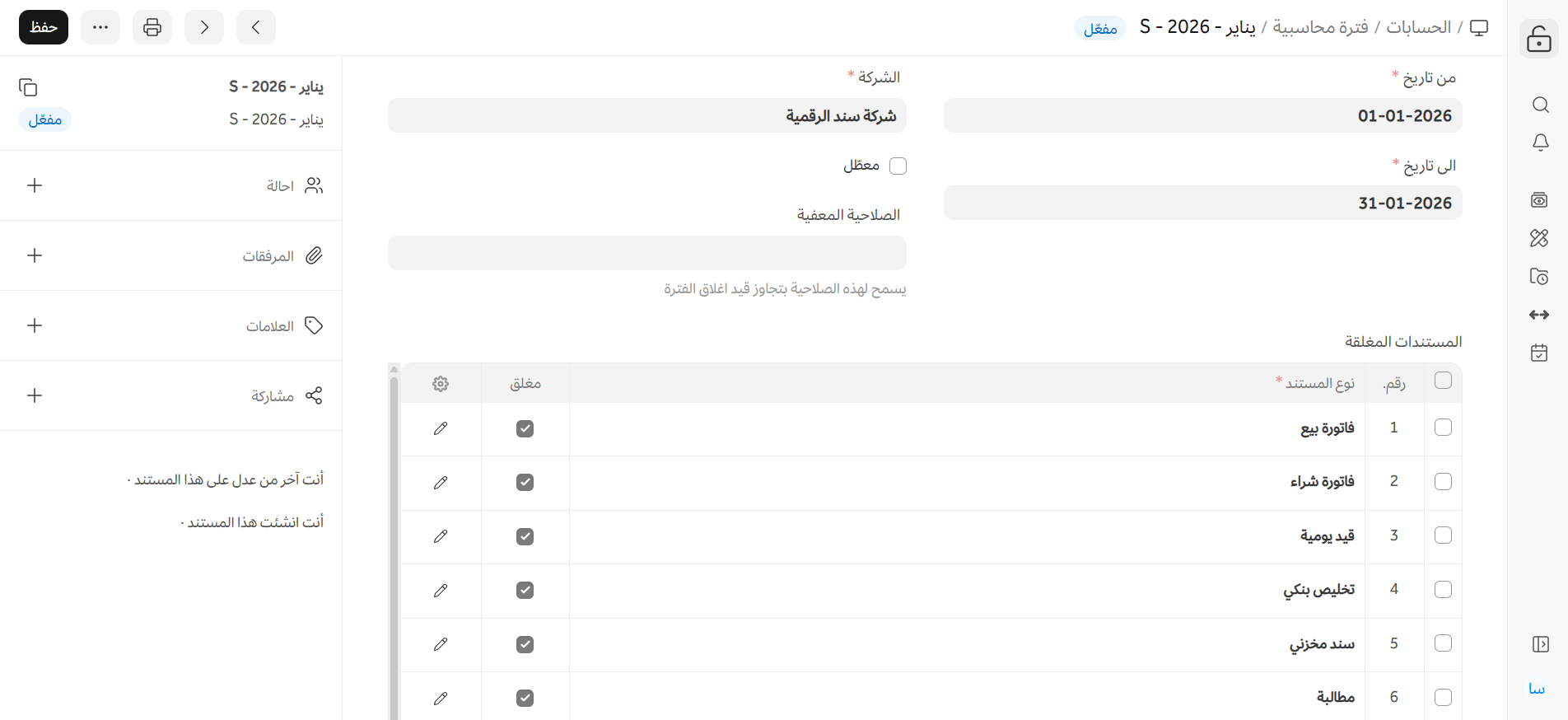 لاحظ أنه إذا انتهت الفترة المحاسبية وإذا لم يتم تحديد "مغلق" لأي من المعاملات المحددة في جدول المستندات المغلقة، فلن يتم تقييدها بعد انتهاء الفترة المحاسبية.