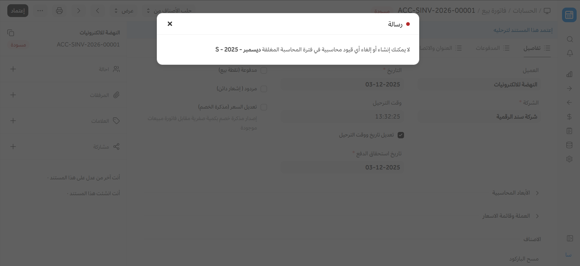 إذا حاولت حفظ معاملة مغلقة بعد انتهاء الفترة المحاسبية، فسترى خطأ في التحقق يمنعك من القيام بذلك.