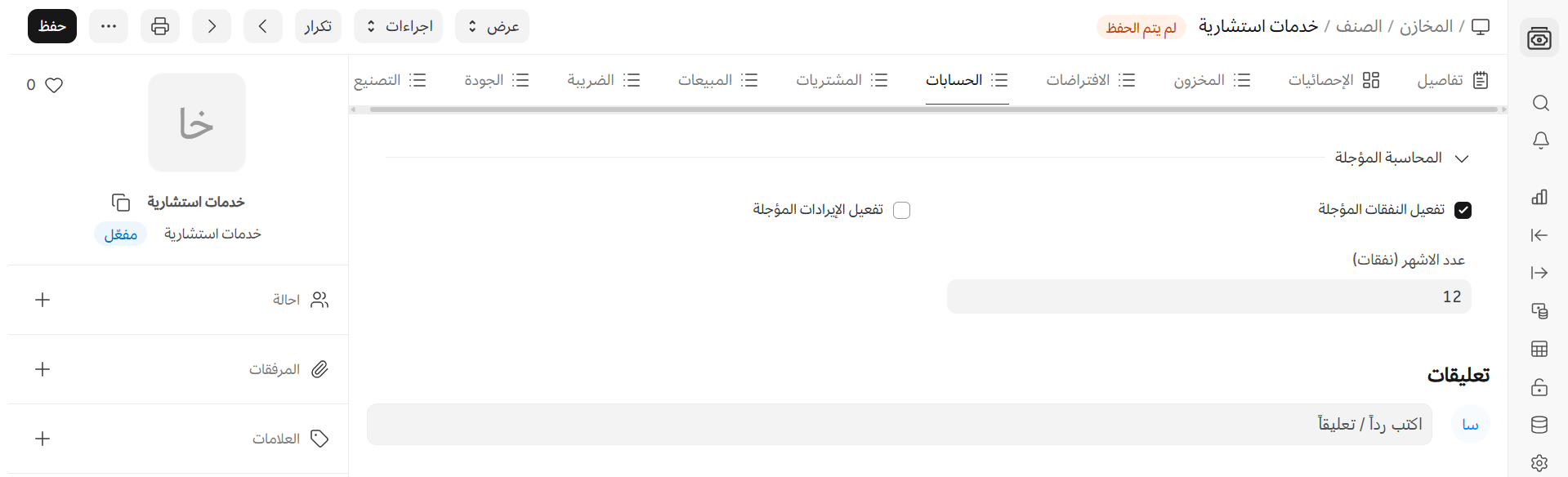 في بيانات الصنف الرئيسية، ضمن قسم المصروفات المؤجلة، حدد خانة حقل تمكين المصروفات المؤجلة. في هذا القسم، يمكنك أيضًا تحديد حساب المصروفات المؤجلة (حساب أصول، يُفضل الأصل المتداول) لهذا الصنف المحدد وعدد الأشهر.