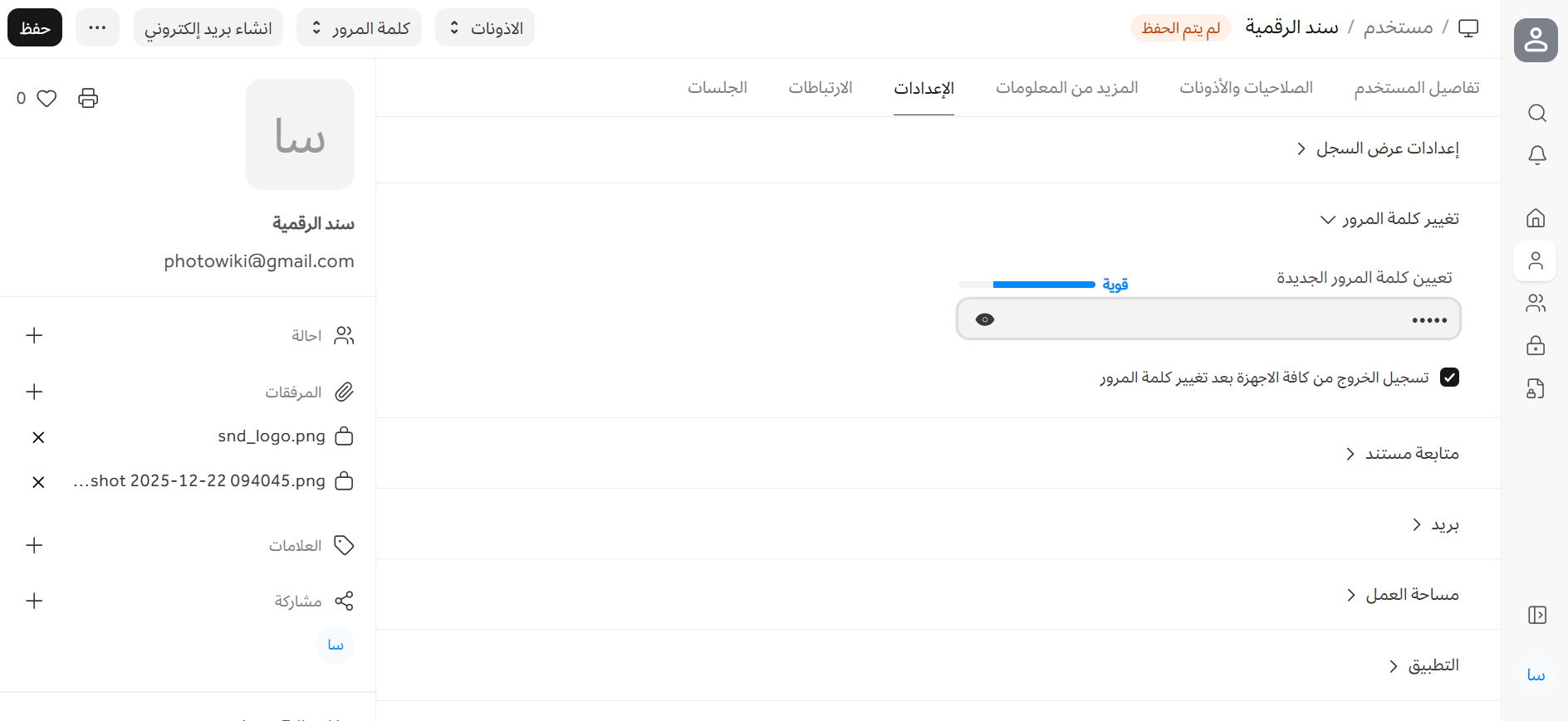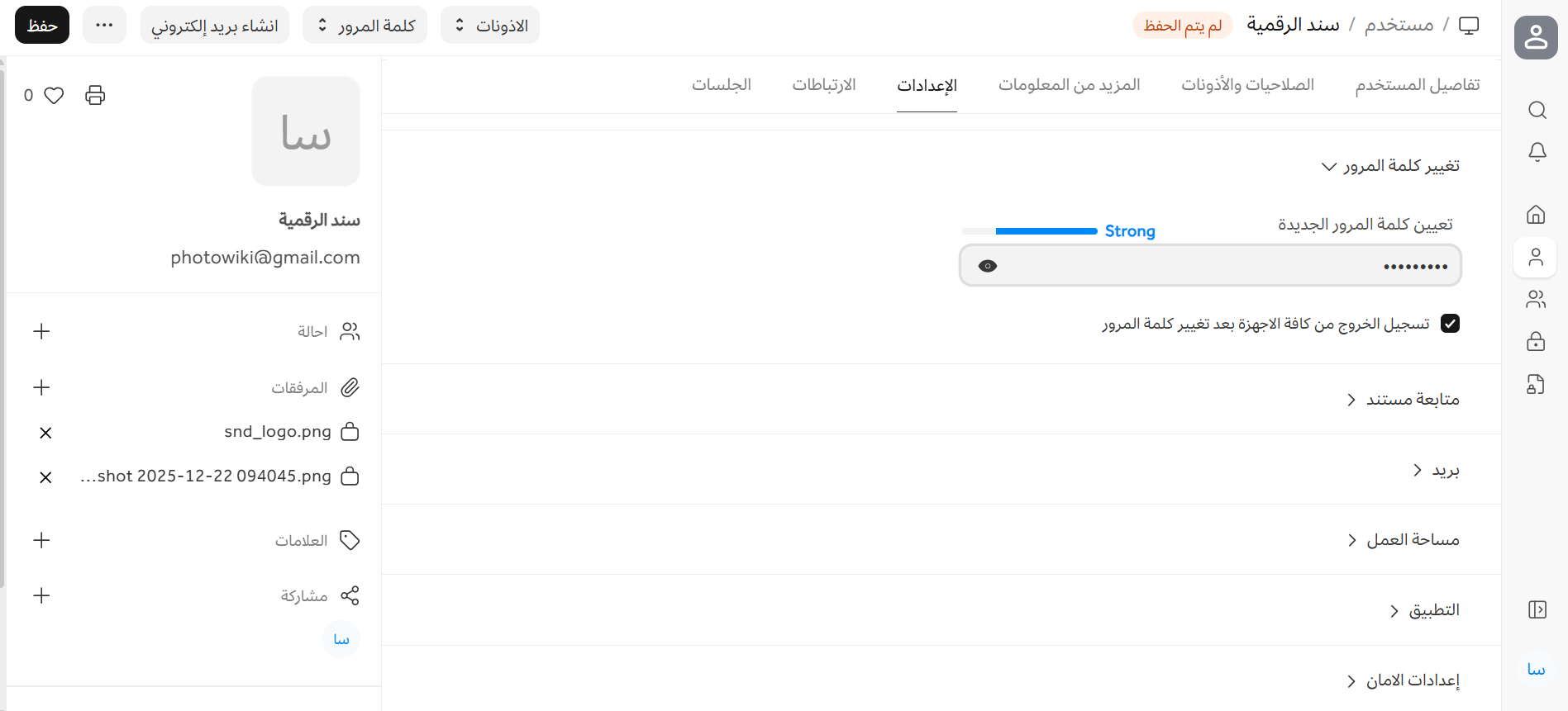 ملاحظة: بناءً على درجة تعقيد كلمة المرور، يعرض النظام مؤشرًا يوضح ما إذا كانت كلمة المرور المُدخلة ضعيفة أو قوية.