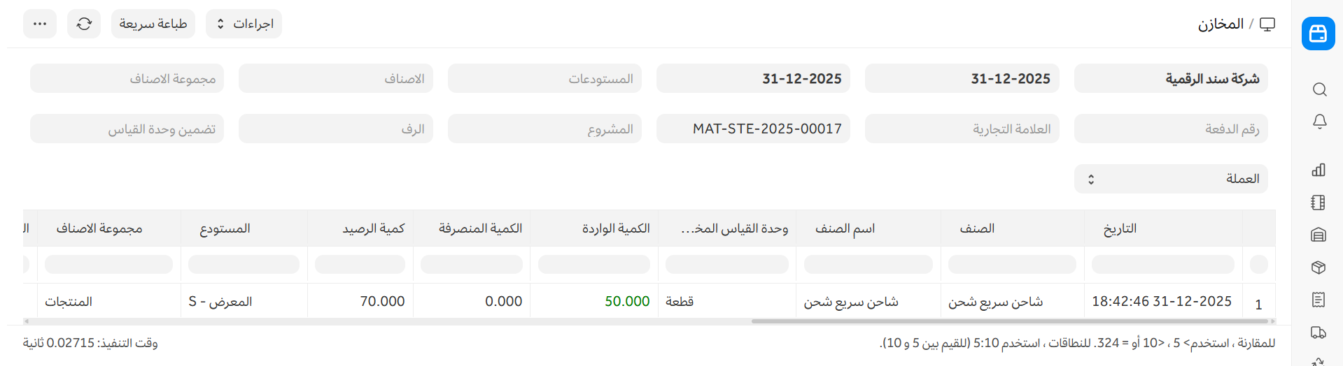 - قيمة الرصيد: تمثل القيمة الإجمالية للكمية المتبقية من المخزون. ويتم احتسابها بضرب سعر التقييم في كمية الرصيد.