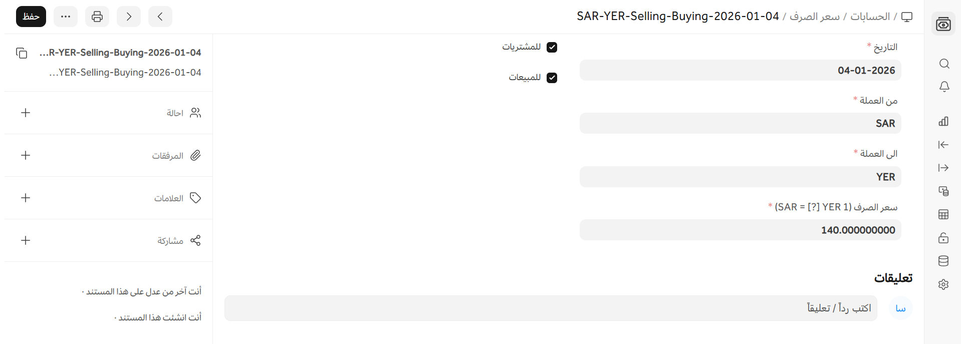- أدخل سعر الصرف، على سبيل المثال، 1 ريال سعودي = 140 ريال يمني.