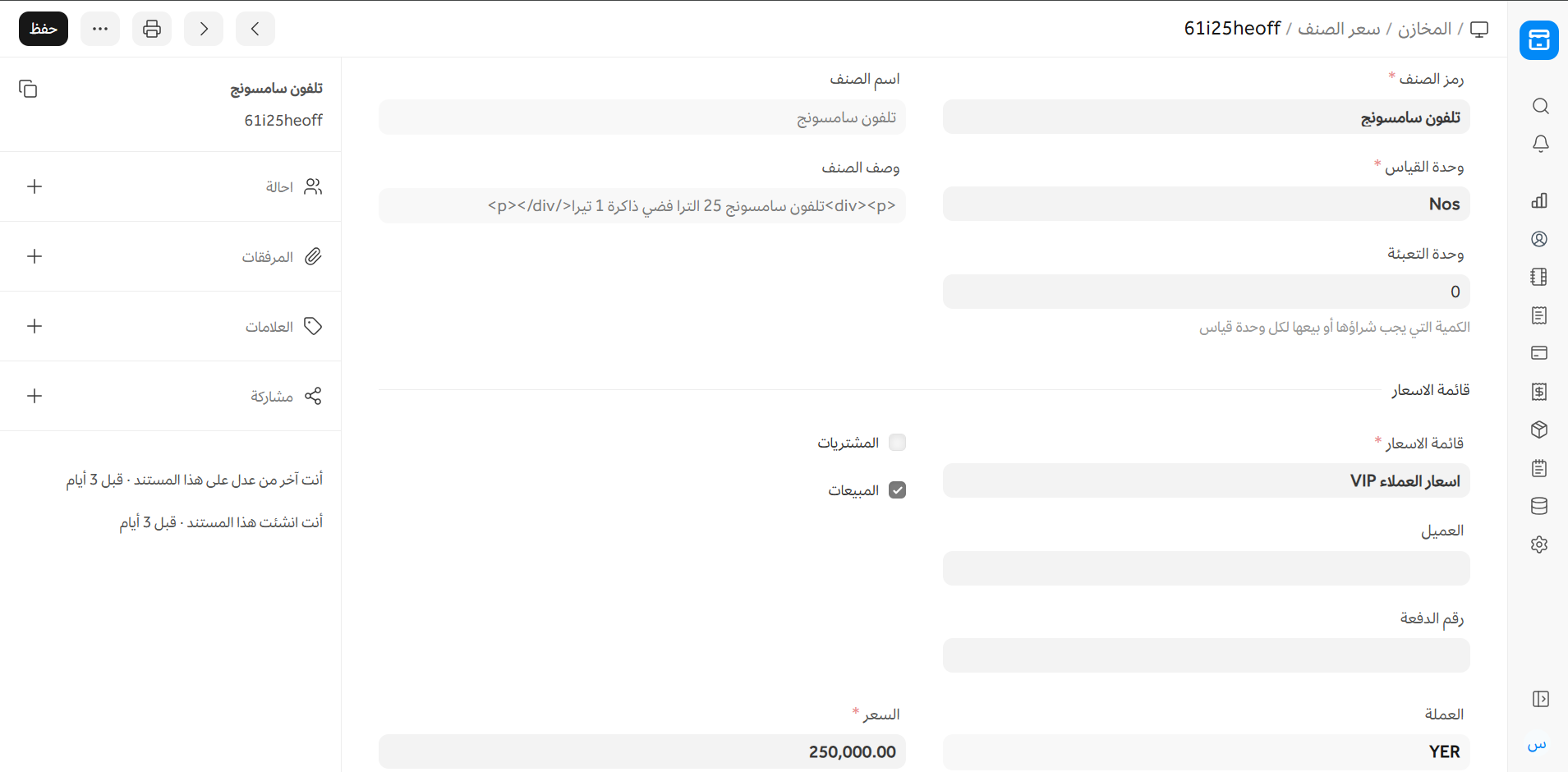 • عند اختيار قائمة أسعار بيع، سيظهر حقل العميل لتخصيص هذا السعر لعميل معين.