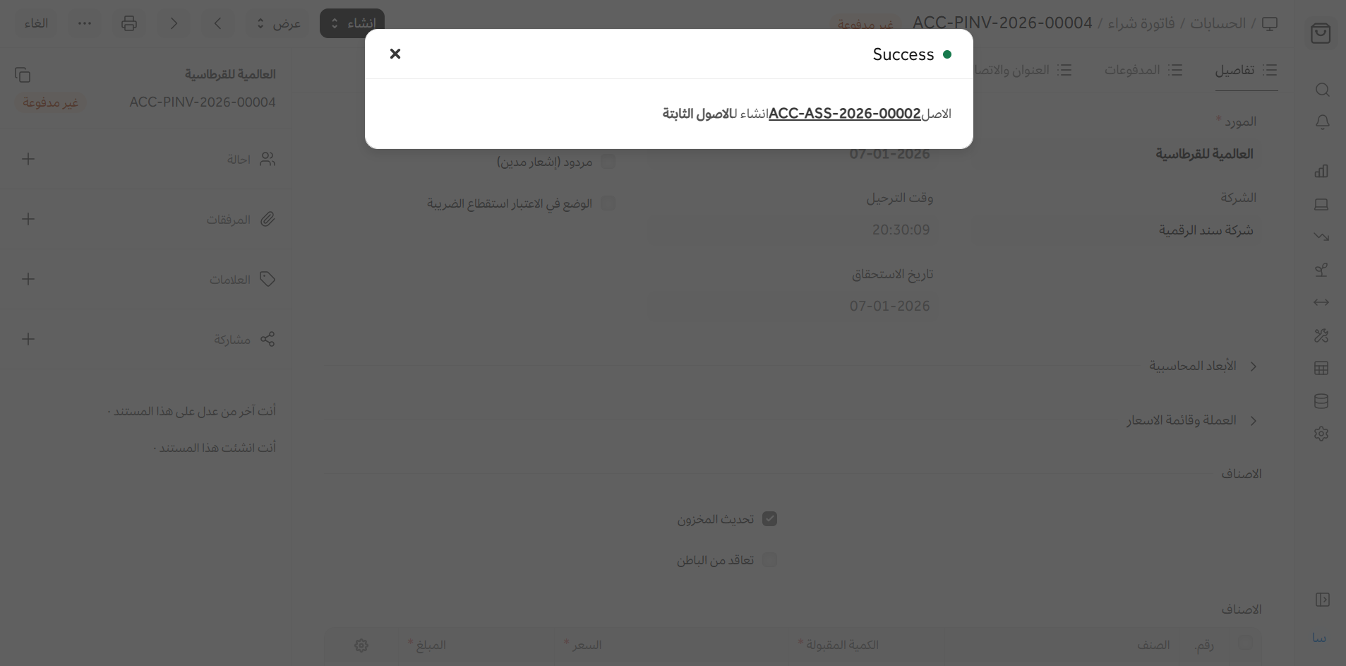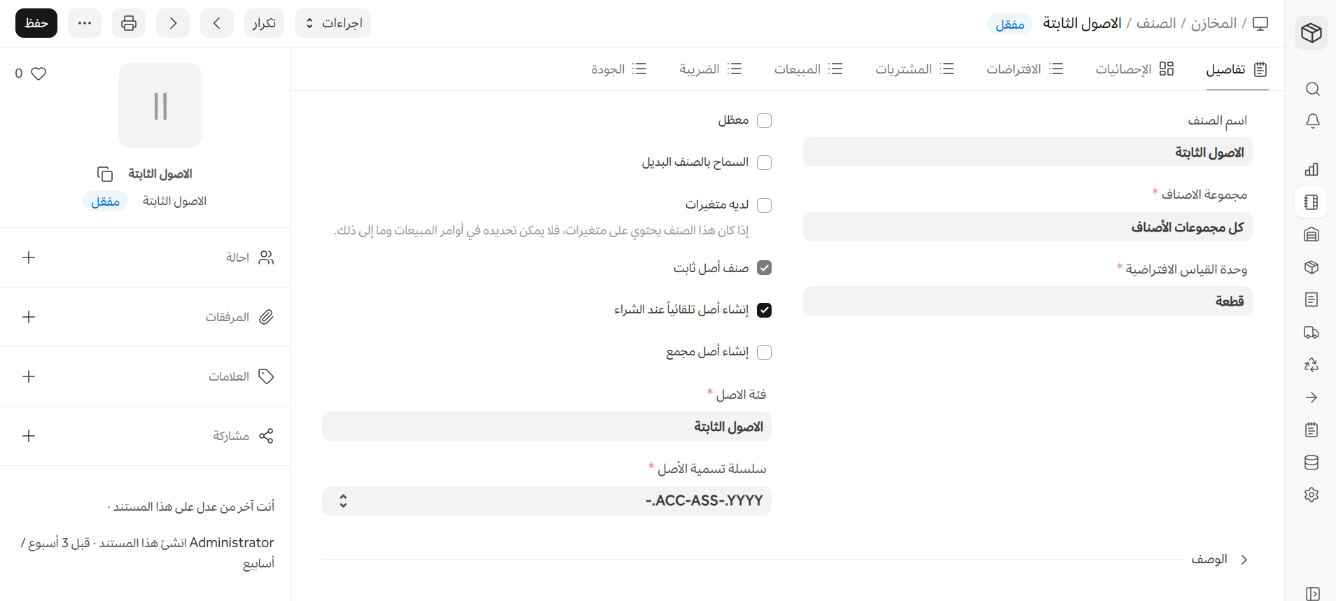 - إنشاء صنف مرتبط مع تفعيل خيار 'أصل ثابت' لإنشاء الأصل.