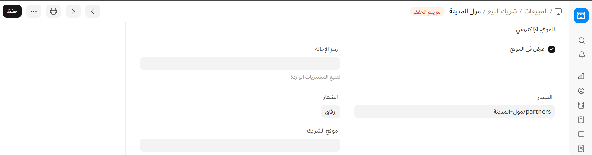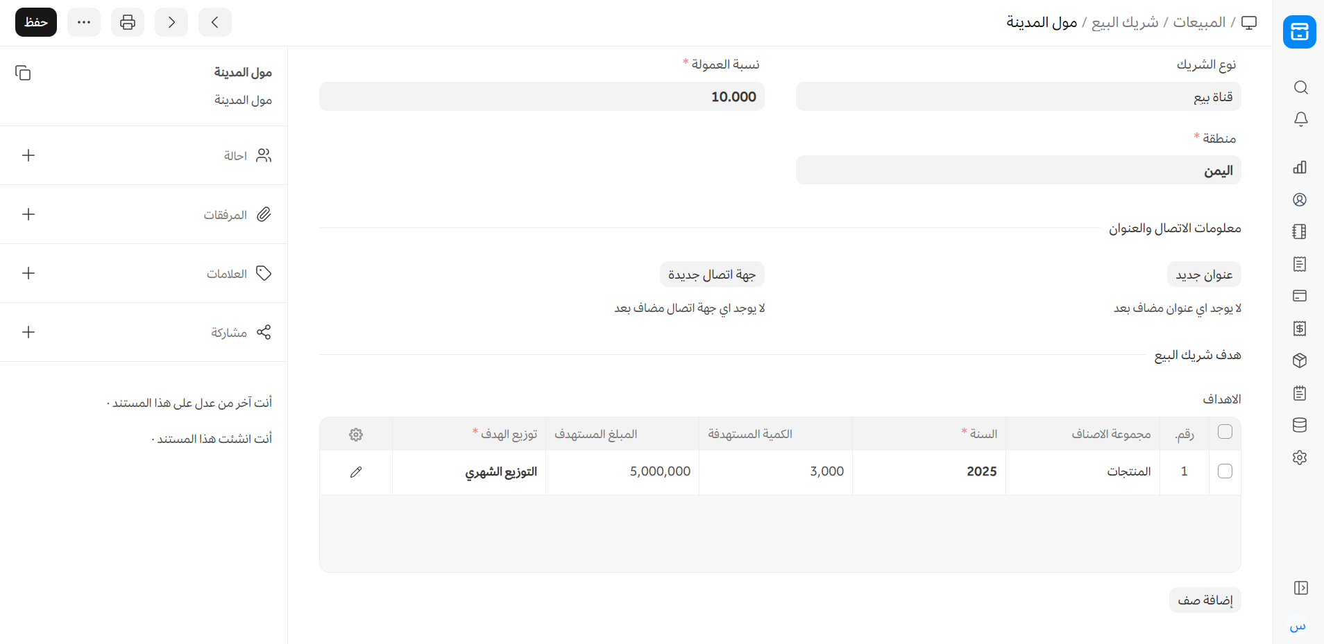 يمكنك إضافة وتتبع عناوين شريك البيع وتفاصيل جهات الاتصال. يمكن إضافتها في قسم "العناوين وجهات الاتصال" في شريك البيع: