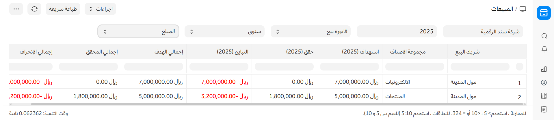 سيوفر هذا التقرير الانحراف بين الأداء الفعلي والهدف لشريك البيع بناءً على بيانات أمر البيع / فاتورة البيع / مذكرة التسليم. يمكن للمستخدم عرض هذا التقرير حسب الفترة مثل شهري، ربع سنوي، نصف سنوي، أو سنوي.