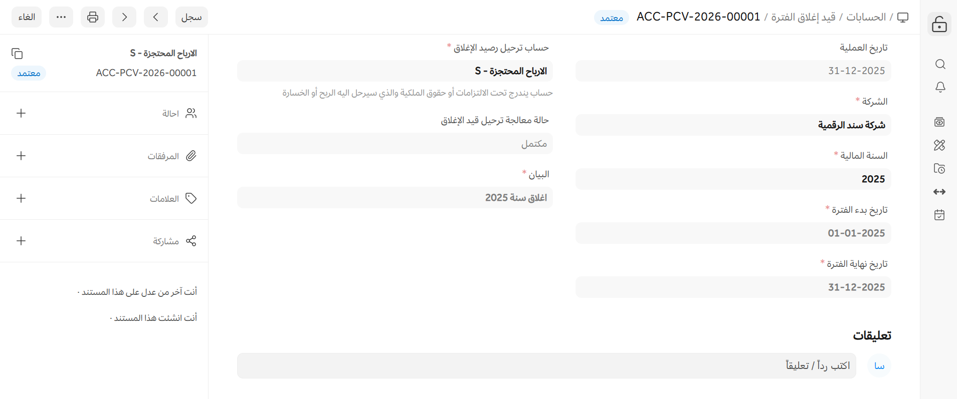 - تاريخ المعاملة: سيكون تاريخ إنشاء قيد إغلاق الفترة.