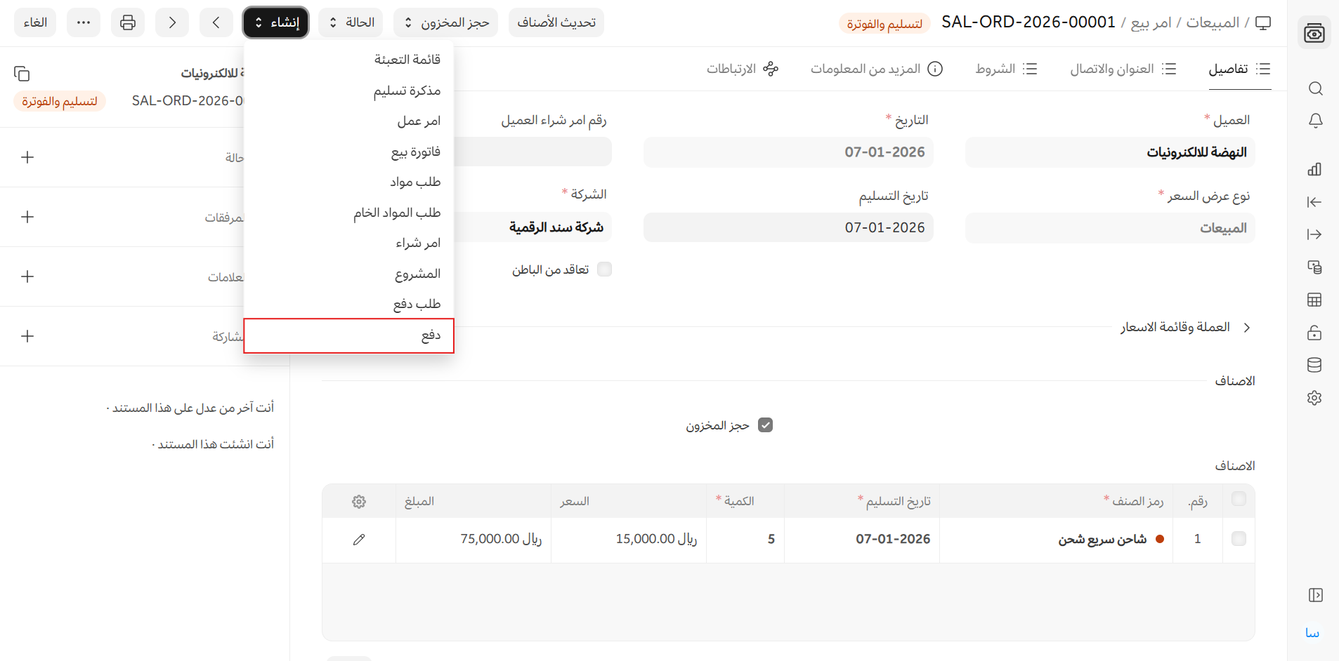 انتقل إلى مستند امر البيع وانقر على إنشاء > دفع.