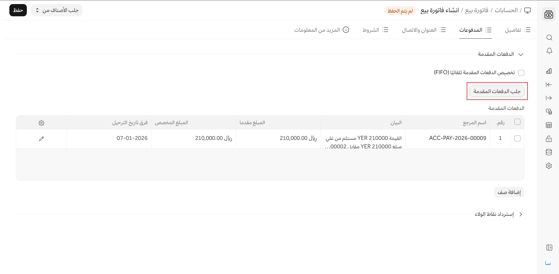 2.2 تخصيص الدفعات المقدمة في الفاتورة