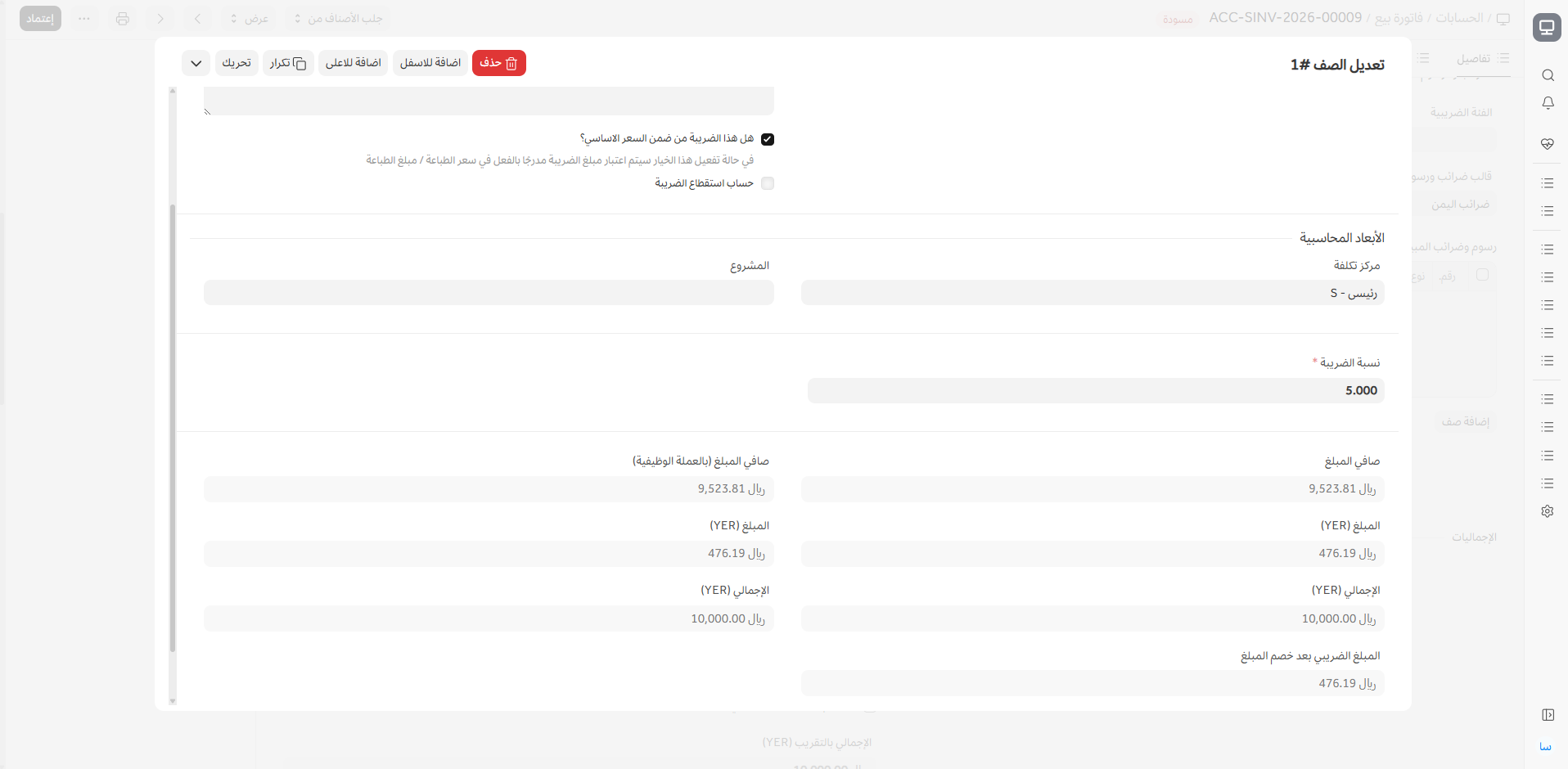 مثال: إذا كان سعر الصنف 10,000 ريال مع معدل ضريبة 5%، يدفع العميل مبلغًا ثابتًا قدره 10,000 ريال، يتم جمع 476.19 ريال منها كضريبة. لتكوين هذا، اتبع الخطوات التالية: