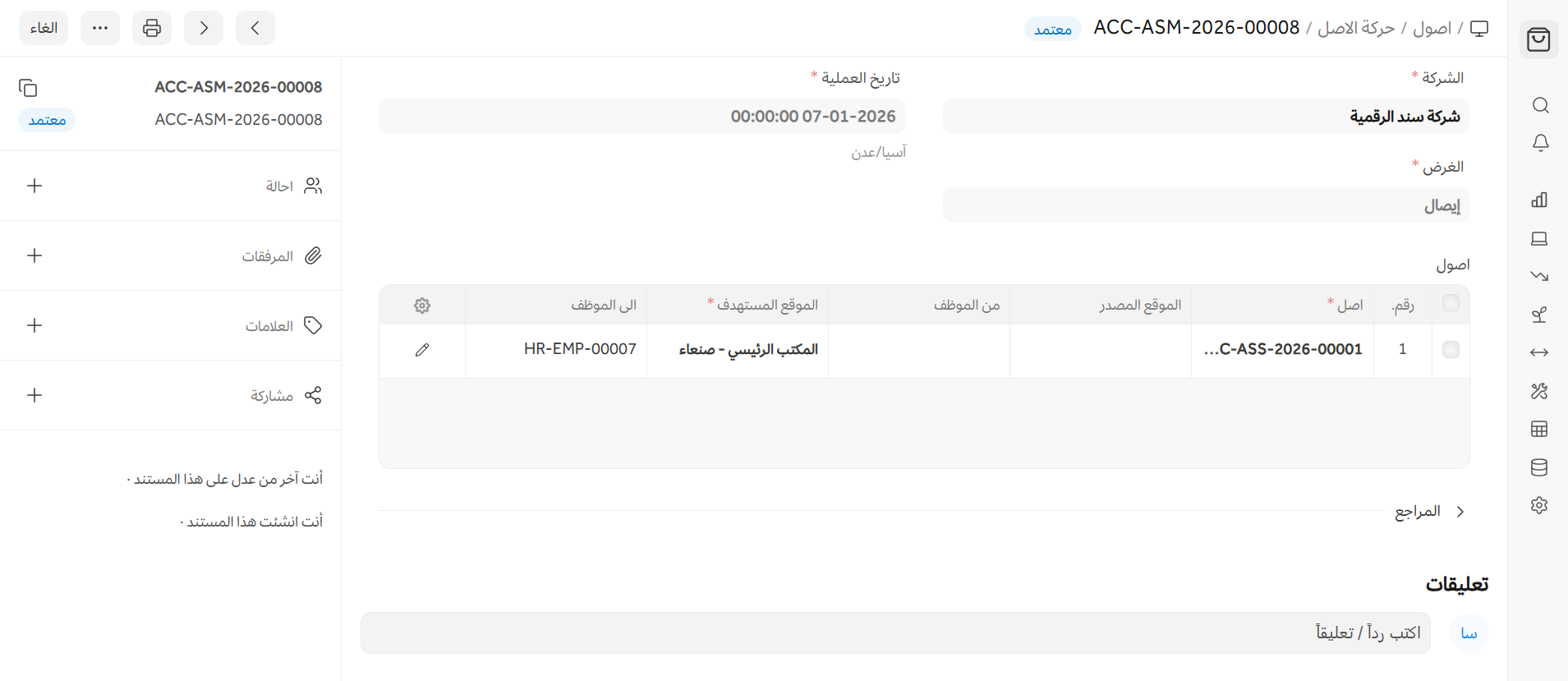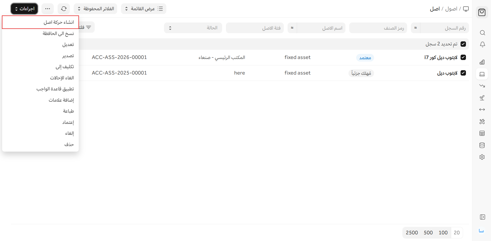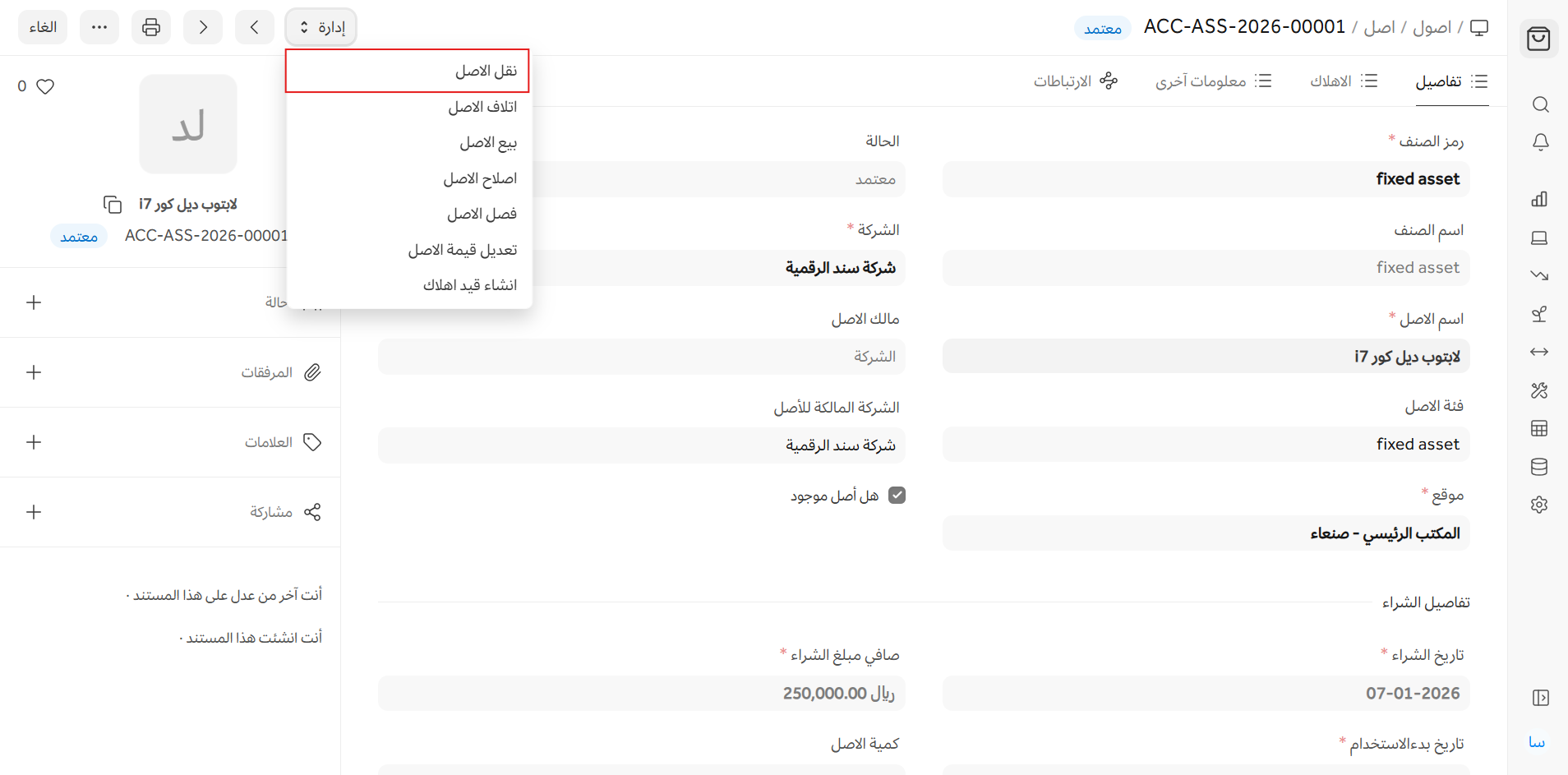 الصفحة الرئيسية > الأصول > الأصول > حركة الأصل