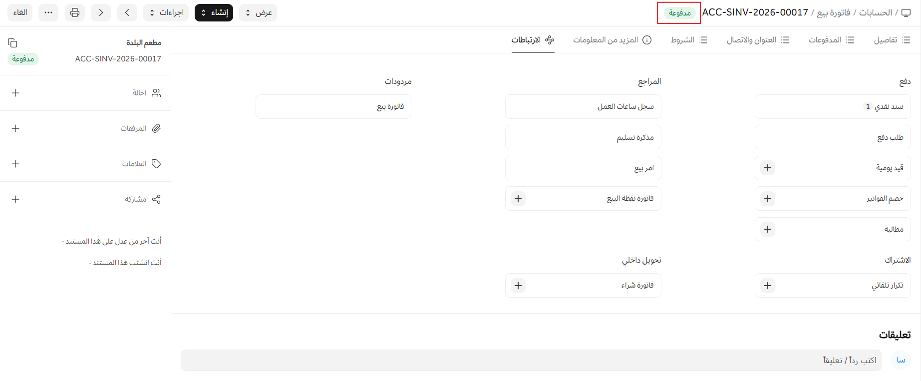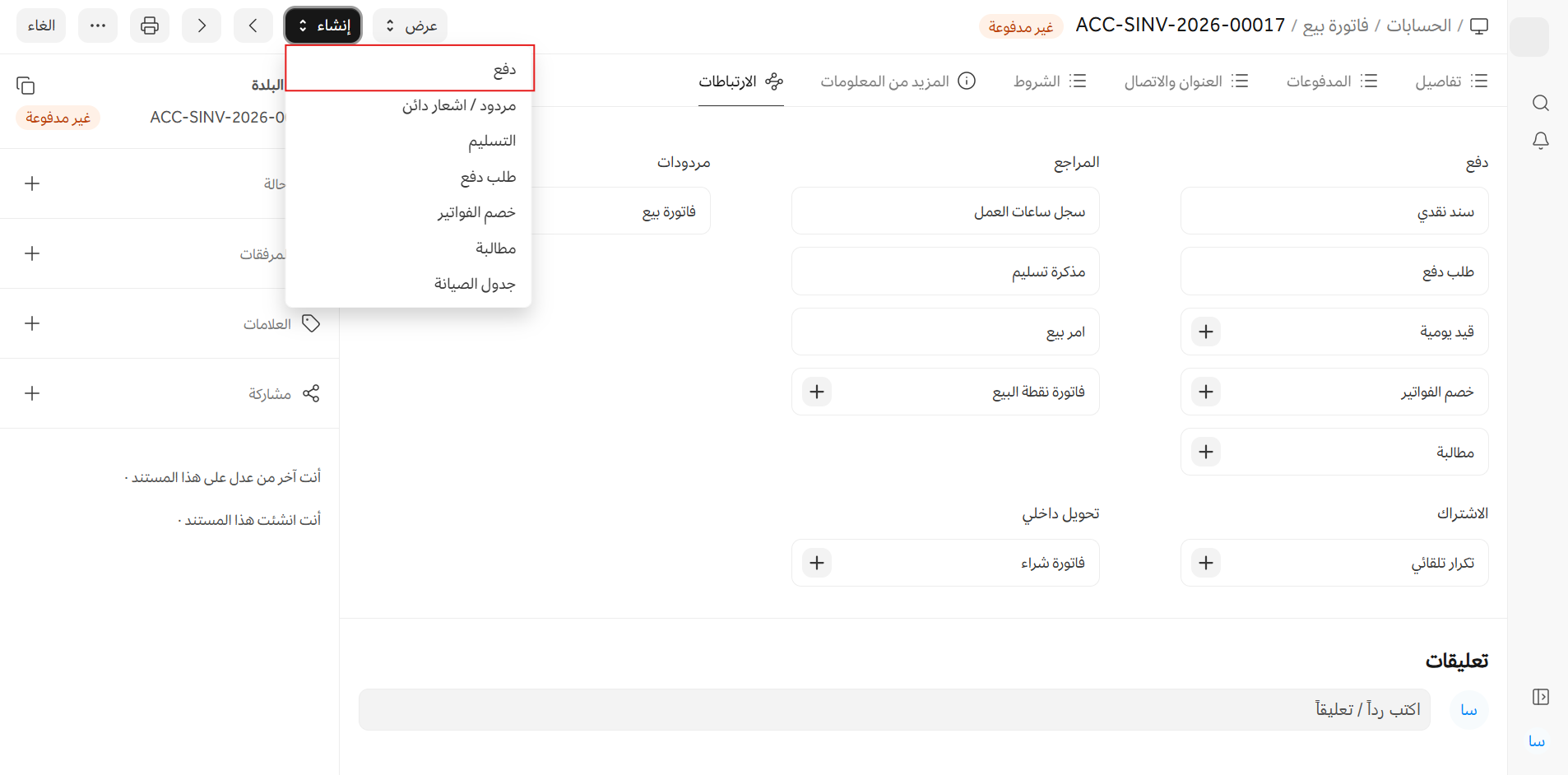 عند اعتماد مستند يمكن إنشاء سند نقدي ضده، ستجد خيار الدفع تحت زر إنشاء.
