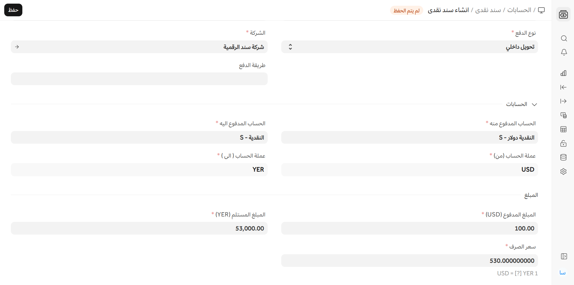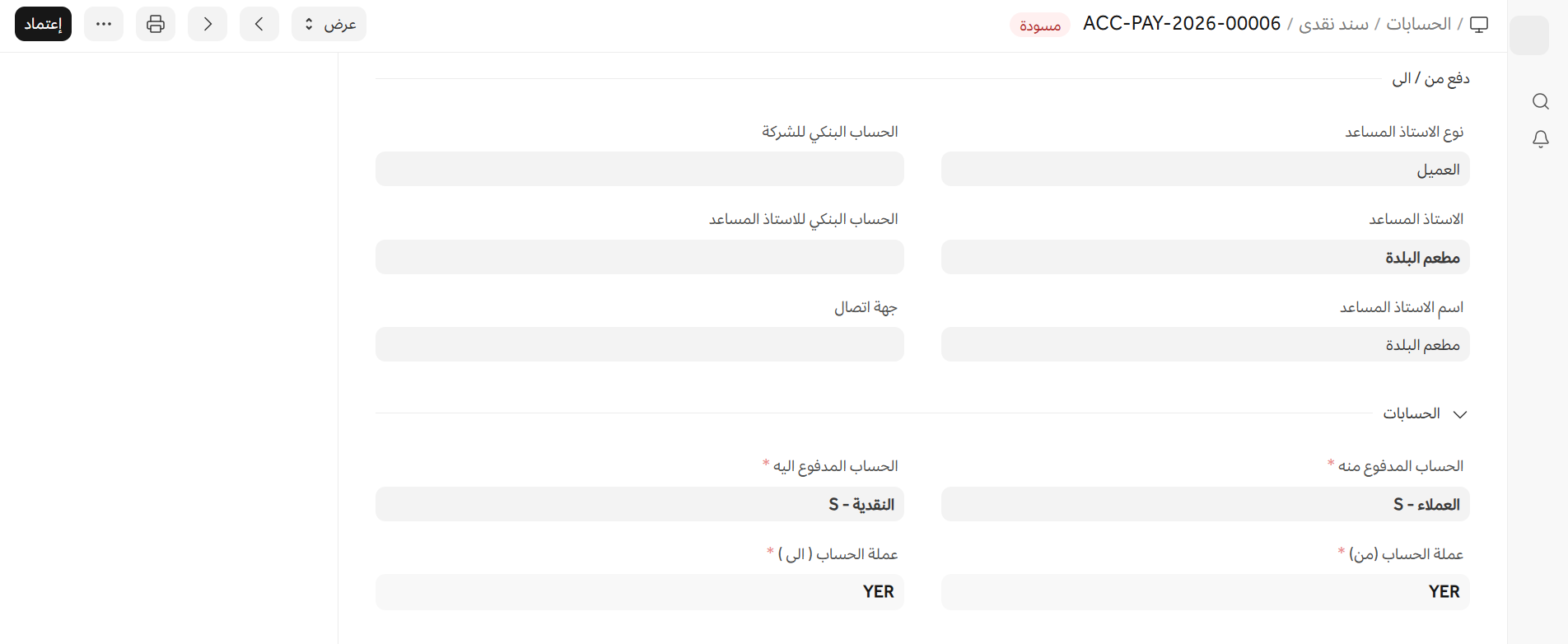 - سيتم جلب الحساب المدفوع إليه والحساب المدفوع منه كما تم تعيينهما في نموذج الشركة.