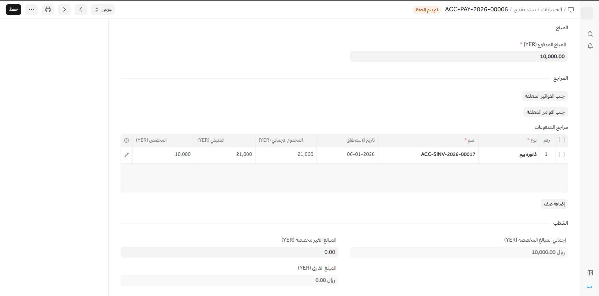 - المخصص: إذا كان المبلغ المدفوع أقل من مبلغ الفاتورة، فسيتم تخصيص المبلغ المدفوع فقط للفواتير التي تم جلبها في السند النقدي. قد يتم الدفع على أجزاء، على سبيل المثال، إذا كان هناك ثلاث فواتير بمبالغ 20، 20، 20، والمبلغ المدفوع هو 60، فسيتم توزيع هذا المبلغ المدفوع بالتساوي. قد تكون شروط الدفع متضمنة أيضًا.
