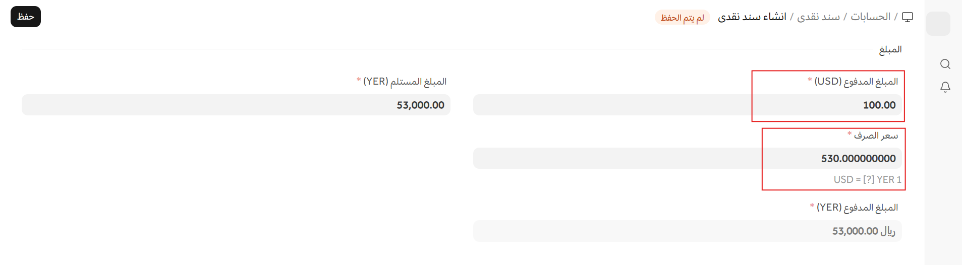 عند إنشاء سند نقدي مقابل تلك الفاتورة، سيتم جلب سعر الصرف الحالي، ولكن يمكنك تعيين سعر الصرف في وقت الدفع لمطابقة سجلاتك.
